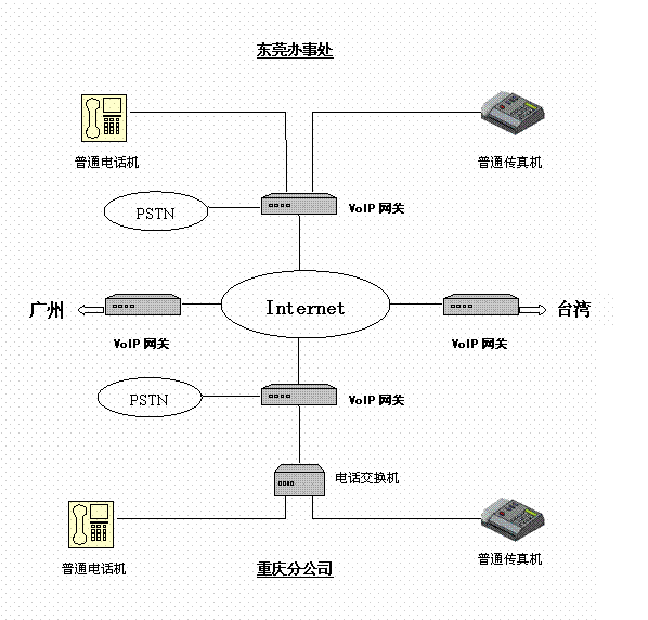 有一家臺商公司,在臺灣、東莞、廣州和重慶自己的分支機(jī)構(gòu),相互之間有大量的通話聯(lián)系,特別是研發(fā)部門,其通話量更是非常大。因此試圖在各個地方之間使用IP電話來降低通訊支出。在實施IP電話服務(wù)之前,各個地方都擁有完善的局域網(wǎng),并且申請了固定IP的寬帶接入。并且在辦公室內(nèi)部署了程控電話交換機(jī)。