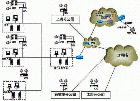 方案中VoIP的應(yīng)用是比較典型的,同時(shí)也有比較特殊的地方:溫州、石家莊等地區(qū)沒有被首創(chuàng)網(wǎng)絡(luò)覆蓋到,而客戶仍想采用IP電話方式,據(jù)此首創(chuàng)網(wǎng)絡(luò)提出了部分通過公網(wǎng)Internet傳輸數(shù)據(jù)的個(gè)性化方案以滿足客戶的需求。
