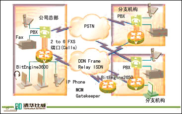 利用清華比威BitEngine系列路由器產(chǎn)品提供的VoIP(Voice over IP)支持,以及該產(chǎn)品具有的安全、加密、QoS、路由等特性,通過(guò)將長(zhǎng)話旁路到數(shù)據(jù)網(wǎng)上,為企業(yè)節(jié)省大量的長(zhǎng)話費(fèi)用開(kāi)銷,同時(shí)利用豐富的接口,同原有的交換機(jī)相連,有效保護(hù)了企業(yè)原先的投資繼續(xù)有效。本方案中,使用清華比威的BitEngine2650/3600路由器實(shí)現(xiàn)企業(yè)間數(shù)據(jù)業(yè)務(wù)和語(yǔ)音業(yè)務(wù)的融合,BitEngine系列路由器提供了完善的QoS保證機(jī)制(支持PQ/WFQ/CBWFQ/WRED等多種隊(duì)列方式),確保語(yǔ)音數(shù)據(jù)的優(yōu)先處理。