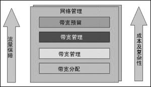 如圖所示,網(wǎng)絡(luò)管理貫穿于四個模塊建立過程中。特定的組件應(yīng)針對網(wǎng)絡(luò)基礎(chǔ)設(shè)施的特定部分而實(shí)施。具體實(shí)施時,應(yīng)首先從帶寬分配模塊開始,然后逐個上移。實(shí)施的模塊越多,保證的品質(zhì)會越高,但同時也增加了管理的復(fù)雜性,加大了維護(hù)成本。