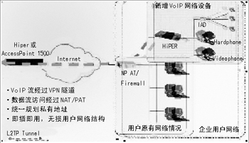 用戶的數(shù)據(jù)網(wǎng)絡仍然通過原有的路由器做NAT/PAT,而新增加的話音部分通過HiPER和上層的VPN服務器建立L2TP的隧道。L2TP隧道可以由用戶端的HiPER發(fā)起,這時HiPER充當L2TP LAC的角色。中心的L2TP服務器也可以選擇HiPER充當L2TP LNS。在網(wǎng)絡規(guī)模較大的地方,還可以使用Access Point 1500或Cisco7120等設備。這種解決方案,有效地解決了數(shù)據(jù)網(wǎng)絡和話音網(wǎng)絡混合的問題。