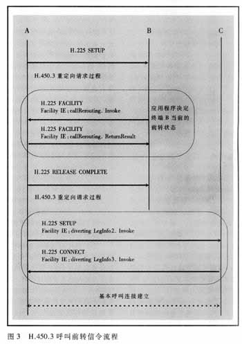 ·呼叫前轉(zhuǎn)。該業(yè)務(wù)包括無條件呼叫前轉(zhuǎn)、遇忙呼叫前轉(zhuǎn)、無應(yīng)答呼叫前轉(zhuǎn)、呼叫轉(zhuǎn)向(Call Deflection)等。它應(yīng)用于呼叫建立階段,將一個(gè)到本終端的來話轉(zhuǎn)向到其它的目的地址,此地址可采用多種形式的別名地址(如電話號碼、IP地址、E-mail地址等)指定。