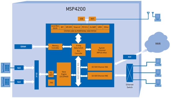 PMC-Sierra VoIP WiFi寬帶路由器方案的核心是MSP4200(見圖),MSP4200支持一個基于DSP的語音引擎,使得該MIPS處理器在管理、信令和高速IP路由任務(wù)中可發(fā)揮出最佳性能。這種架構(gòu)確保了相當(dāng)于固定線路快速以太網(wǎng)路由速度以及防火墻性能,并能同時在四個通道提供VoIP服務(wù)。另外它還有一個PCI接口以提供更多靈活性,支持各種802.11