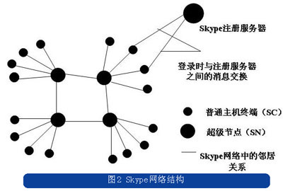 與常規(guī)的電信業(yè)務(wù)網(wǎng)絡(luò)不同的是,Skype的網(wǎng)絡(luò)中除了注冊(cè)服務(wù)器,沒(méi)有其他任何集中的服務(wù)器,只是將用戶節(jié)點(diǎn)分為普通節(jié)點(diǎn)和超級(jí)節(jié)點(diǎn)。Skype的系統(tǒng)連接結(jié)構(gòu)如圖2所示。