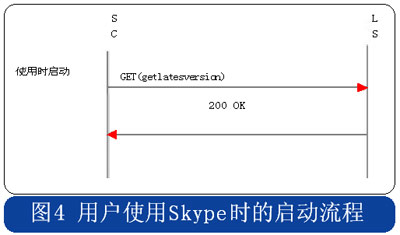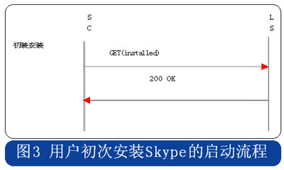 Skype的用戶終端啟動(dòng)時(shí),采用HTTP協(xié)議連接到注冊(cè)服務(wù)器,用戶初次安裝的啟動(dòng)流程中攜帶“installed”的參數(shù),使用時(shí)啟動(dòng)流程則在消息中攜帶“getlatestversion”參數(shù),具體流程分別見(jiàn)圖3和圖4。