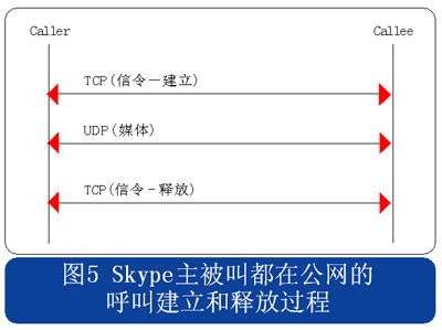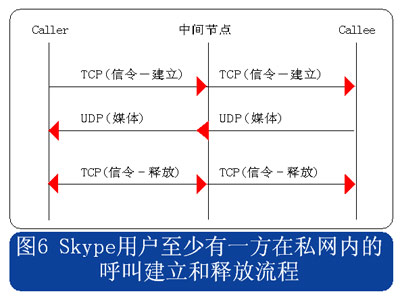 從上述流程圖可見(jiàn),Skype的呼叫信令都采用TCP封裝,而媒體流則使用UDP封裝,當(dāng)有任何一方用戶位于限制UDP包的防火墻內(nèi)時(shí),媒體流就會(huì)采用TCP封裝。另外當(dāng)Skype用戶至少有一方位于私網(wǎng)內(nèi)時(shí),所有的信令和媒體消息都經(jīng)過(guò)一個(gè)或多個(gè)中間節(jié)點(diǎn)轉(zhuǎn)發(fā)。此時(shí)無(wú)需擔(dān)心用戶通話的媒體流因?yàn)榻?jīng)過(guò)中間節(jié)點(diǎn)轉(zhuǎn)發(fā)而被竊聽(tīng),因?yàn)镾kype采用了對(duì)消息進(jìn)行端到端加密的機(jī)制。