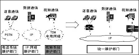通過IP化改造,原來分別管理IP網(wǎng)絡(luò)和電話網(wǎng)絡(luò)的兩個部門可以有效整合,有助于簡化機(jī)構(gòu)設(shè)置和工作流程,實(shí)現(xiàn)對行業(yè)通信系統(tǒng)的統(tǒng)一管理,提高行業(yè)科技部門的工作效率(見圖1)。