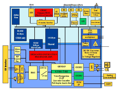 例如,SC14438是一個(gè)優(yōu)化了的CMOS芯片,能夠進(jìn)行DECT(1.9GHz)內(nèi)或2.4GHz ISM數(shù)字頻帶手機(jī)內(nèi)需要的所有音頻、信號(hào)及數(shù)據(jù)處理。一個(gè)ADPCM代碼轉(zhuǎn)換器,一個(gè)低功耗的編解碼器(CODEC)及模擬前端被集成于該芯片中,提供麥克風(fēng)與(動(dòng)態(tài)的)揚(yáng)聲器之間直接的連接。同時(shí)還整合了雙工免提操作。SC14438的設(shè)計(jì)適用于任一無(wú)線(xiàn)產(chǎn)品設(shè)計(jì)。一個(gè)專(zhuān)用的TDMA控制器能夠處理所有的物理層時(shí)隙和無(wú)線(xiàn)控制。美國(guó)國(guó)家半導(dǎo)體公司的標(biāo)準(zhǔn)小型RISC