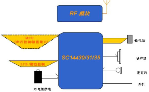DECT的座機(jī)部分可以根據(jù)應(yīng)用,選擇配置采用獨(dú)立模式或外接MCU的模式工作,方便用戶(hù)靈活擴(kuò)展功能。外接MCU通過(guò)RS232口或SPI口與基帶處理器SC14438/37/35連接,實(shí)現(xiàn)控制/數(shù)據(jù)的交互。
