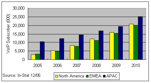 應(yīng)該說在2006年,VoIP技術(shù)已經(jīng)不是阻礙其市場發(fā)展的主要因素,因?yàn)镮n-Stat在全球個人VoIP消費(fèi)市場中作的調(diào)查顯示,約9%的VoIP用戶甚至不清楚自己在使用IP傳輸;有64%的用戶在使用免費(fèi)的VoIP服務(wù)。其次有超過73%的用戶并不把是否使用IP技術(shù)當(dāng)成選擇該業(yè)務(wù)的影響因素。而寬帶接入市場的競爭則構(gòu)成了VoIP發(fā)展的關(guān)鍵因素,作為一種寬帶應(yīng)用,誰的接入資源占據(jù)了用戶家庭,誰就可以決定是否采用VoIP技術(shù)來提供語音業(yè)務(wù)。在歐洲法國Free Telecom與意大利的FastWeb都是三重播放業(yè)務(wù)的積極推進(jìn)者,在VoIP市場居領(lǐng)先地位;在日本Yahoo!BB擁有亞洲地區(qū)50%的寬帶VoIP用戶。幾乎所有這些寬帶ISP提供商往往采用包月的形式或者以極低的費(fèi)用提供無限制的本地或國內(nèi)通話,在國際長途電話上提供極大的折扣。