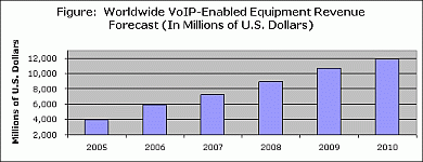 2006年11月?lián)y(tǒng)計,全球VoIP設(shè)備銷售收入將從2005年的39.5億美元增長到2010年的119億美元,年度復(fù)合增長率為24.7%。如下圖所示。VoIP市場主要包括三個用戶群:用于企業(yè)的專用電話交換機(jī)(PBX),服務(wù)供應(yīng)商的基礎(chǔ)架構(gòu)以及住宅接入設(shè)備。