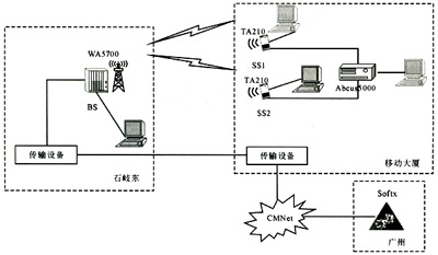 組網(wǎng)時(shí),由于BS(石岐東)需要與廣州的SoftX連接,因此,實(shí)際組網(wǎng)方案通過(guò)傳輸設(shè)備連接公安局與移動(dòng)大廈;然后通過(guò)移動(dòng)大廈的CMNet網(wǎng)絡(luò)連接廣州的SoftX。在該個(gè)組網(wǎng)中,視距傳播環(huán)境通過(guò)固定在移動(dòng)大樓支架上的遠(yuǎn)端站實(shí)現(xiàn),非視距傳播環(huán)境通過(guò)移動(dòng)的遠(yuǎn)端站實(shí)現(xiàn)。