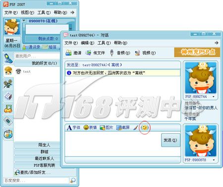 P5P和酷寶很類似,不過它沒有集成MSN,僅是在界面上模仿MSN,文本聊天框就是MSN翻版,MSN經(jīng)典的閃屏震動功能也有。P5P還在在好友列表上加進了一些QQ的元素。