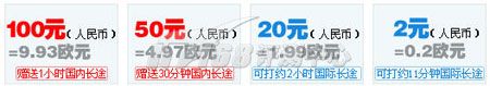 在skype的資費列表中,沒有人民幣選項,在Tom-Skype的充值選項中,僅提供了四種金額的充值100、50、20、和2元。從官方站點查到的價格為0.017歐元/分鐘(約合人民幣0.17元/分鐘)