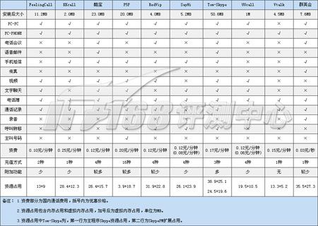 單獨安裝每一個軟件到測試系統(tǒng)中,查看文件大小。注冊帳號,順序測試軟件的每項功能,包括語音、視頻、文本及附加功能;在效果測試部分,測試每一個軟件PC-PHONE的語音效果,分別撥打固定電話及移動電話,測試兩端的語音效果。性能測試部分為記錄每款軟件在運行時的系統(tǒng)資源占用情況,包括內(nèi)存使用和虛擬內(nèi)存大小兩部分。