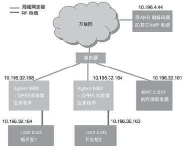 8960 ,將GRPS實(shí)驗(yàn)室應(yīng)用測(cè)試集用作媒介,將 i.250 2.5G 開發(fā)板卡 (ADS板卡)連接到互聯(lián)網(wǎng)。ADS板卡在接通電源時(shí),注冊(cè)登錄到GPRS網(wǎng)絡(luò),測(cè)試集然后通過(guò)路由器連接到互聯(lián)網(wǎng)。測(cè)試集充當(dāng)連接到GPRS的DUT的橋梁,讓它們接入互聯(lián)網(wǎng)。一旦GPRS上下文激活,測(cè)試集將為ADS分配一個(gè)固定IP地址。此外,在PC上運(yùn)行的代理服務(wù)器也連接到同一個(gè)路由器。通過(guò)這種安排,確保三個(gè)實(shí)體都能在同一網(wǎng)段內(nèi)運(yùn)行。這樣就能對(duì)同一個(gè)網(wǎng)段內(nèi)的分組流量進(jìn)行監(jiān)控,用于開發(fā)目的。