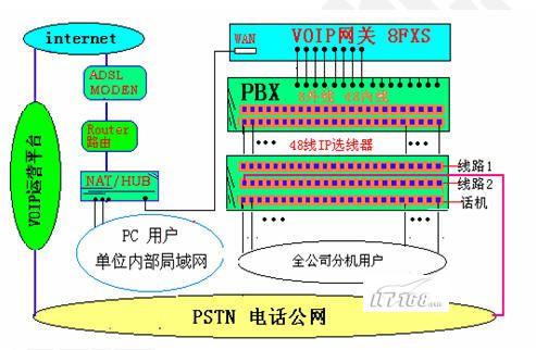 如果現(xiàn)有網(wǎng)絡(luò)接入方式為ADSL寬帶撥號上網(wǎng),全公司共享上網(wǎng)使用,如果想要支持超過4人以上同時通話,為了使數(shù)據(jù)和語音互相不爭用帶寬,必須考慮另外申請一條ADSL。下圖為PBX、VOIP、選路器接線圖: