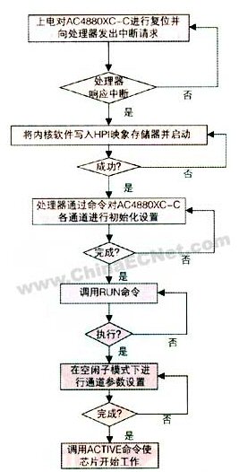 主要是基于嵌入式arm處理器,通過(guò)hpi接口實(shí)現(xiàn)對(duì)ac4880xc-c及相關(guān)芯片的讀寫(xiě)操作。流程圖如圖5所示: