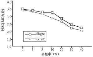 MOS分數(shù)比GTalk高,如圖8所示。在丟包率為5%時,Skype添加了過多的冗余,消耗了過多的網(wǎng)絡帶寬,而PESQ