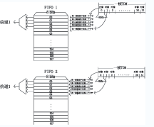 FIFO中的四幀數(shù)據(jù)被讀空時(shí)間大于第五幀的第一個(gè)字節(jié)寫入FIFO的準(zhǔn)備時(shí)間,F(xiàn)IFO的寫滿與讀空都是有硬件產(chǎn)生信號標(biāo)識,此時(shí)FIFO讀空信號標(biāo)識未產(chǎn)生,不能對同一FIFO進(jìn)行寫操作,導(dǎo)致待寫數(shù)據(jù)丟失。因此選用兩個(gè)FIFO采用乒乓機(jī)制來切換讀寫操作,如圖4所示!