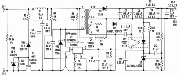 整個電源效率為78%,這樣1個簡單的反激電源能提供3.3V(2A)。對大多數(shù)應用來講,低成本和簡單化是最重要的特性。假若采用同步整流正激轉換器拓撲和具有較低通導功耗、較高功率的器件DPA424G,則電路效率可增加5%~10%。