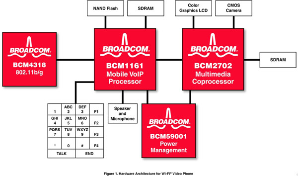 該方法的一個(gè)例子如圖1所示。該方案支持接入到本地?zé)o線網(wǎng)絡(luò)的Wi-Fi 接口上的全雙工語音和視頻,它已經(jīng)有了成功的實(shí)現(xiàn)案例,并計(jì)劃用于一款新型的消費(fèi)產(chǎn)品設(shè)計(jì)。所有高級(jí)的呼叫建立和管理、音視頻同步以及應(yīng)用層都在一片BCM1161 VoIP器件上運(yùn)行。為實(shí)現(xiàn)這些功能采用了一片嵌入式通用ARM926E RISC CPU,還有一片嵌入式DSP用于音視頻編解碼和回波消除。利用一個(gè)BCM4318E 802.11b/g Wi-Fi無線網(wǎng)絡(luò)接口,BCM1161提供了為實(shí)現(xiàn)一個(gè)具有成本效益的Wi-Fi手機(jī)的語音所需的全部功能。