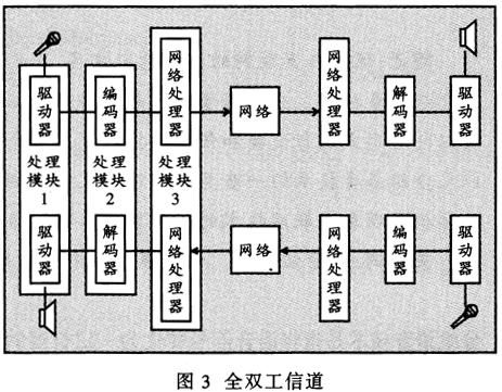 ——傳輸是依靠每一端三級(jí)的同步有效操作。如圖3所示,在像IP電話這樣的全雙工通信中,每一端的六級(jí)都是連續(xù)工作的。因此在具體應(yīng)用時(shí)為了減少分離處理的數(shù)量,這六級(jí)被合成同時(shí)工作的三個(gè)處理過(guò)程。