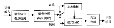 文本有關聲紋識別系統(tǒng)的一種典型結構如圖所示,它包括訓練和識別兩個階段。訓練時,每個說話人重復一定次數(shù)的發(fā)音,然后檢測并分析每次發(fā)聲的語音段,以提取特征,并利用動態(tài)時間規(guī)整技術,在時間上對齊特征序列且多次平均,形成每個說話人的參考模板。識別時,對語音信號進行特征分析,然后計算與參考模板的距離,選取其中的最小值作為結果輸出。說話人確認系統(tǒng)則是計算待識特征與聲明說話人模板的距離,并與設定的閾值比較,若高于閾值則拒絕判決,低于閾值則接受判決。