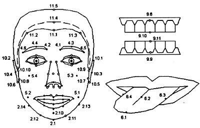 現(xiàn)在運(yùn)行的系統(tǒng)中多為參數(shù)控制系統(tǒng),其中控制參數(shù)也多采用MPEG-4所定義的人臉動(dòng)畫參數(shù)(facial animation parameter,FAP)。MPEG-4制定了一整套人臉模型化描述方法,包括用于定義人臉模型的面部定義參數(shù)(facial define parameters,FDP)和一組用于定義人臉面部動(dòng)作的人臉動(dòng)畫參數(shù)FAP。其中FDP通過對人臉上84個(gè)特征點(diǎn)的位置信息來定義人臉模型,這些點(diǎn)不僅包括外表看得見的人臉特征點(diǎn),還包括了舌頭、牙齒等口腔內(nèi)器官的特征點(diǎn),如圖1所示。