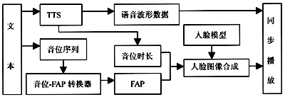 FAP一共有68個(gè)參數(shù),包括兩個(gè)高級參數(shù)和66個(gè)低級參數(shù)。高級參數(shù)是視位(viseme)和表情(expression),視位分為15個(gè),分別表示人們發(fā)某一音位時(shí)的面部動(dòng)作;表情分為高興、悲傷、憤怒、害怕、厭惡、驚奇六種。66個(gè)低級參數(shù)用來控制部分FDP特征點(diǎn)的運(yùn)動(dòng),進(jìn)而形成各種復(fù)雜的人臉動(dòng)作。這些標(biāo)準(zhǔn)的制定極大地推動(dòng)了參數(shù)控制合成方法的發(fā)展,使這種方法在人機(jī)交互、計(jì)算機(jī)網(wǎng)絡(luò)交談、游戲動(dòng)畫等方面得到更為廣泛的應(yīng)用,圖2 是參數(shù)控制的TTVS系統(tǒng)的基本框架。