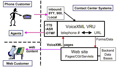 從圖中我們可以看出,同傳統(tǒng)的INTERNET網(wǎng)站相比,在不需要太大的改動前提下,只要增加一個VoiceXml的服務器處理來自PSTN的應用即可。在VoiceXml的服務器中,包含了VoiceXml的解釋器(VoiceXml解釋程序語境),VoiceXml自帶的瀏覽器,自動語音識別(ASR)及文本到語音(TTS)的轉(zhuǎn)換設備。