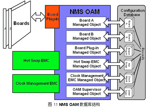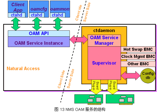 NMS公司的OAM組件是作為Natural Access服務(wù)提供給用戶的,用以管理一個(gè)機(jī)架甚至多個(gè)機(jī)架上的NMS板卡和軟件模塊。OAM即操作(Operation)、管理(Administration)、維護(hù)(Maintenance),通過(guò)OAM可以創(chuàng)建、刪除、查詢OAM下的各組件的配置,啟動(dòng)、終止或測(cè)試組件的運(yùn)行,以及接收從組件發(fā)出的告警等事件通知。