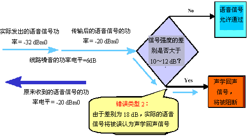 然而,如果判斷過程是根據(jù)功率電平的相對(duì)差異來進(jìn)行的(而不是絕對(duì)差異),測(cè)量結(jié)果將更為準(zhǔn)確。通過在靜音期間測(cè)量?jī)蓚(gè)傳輸方向上的線路功率電平,就能得知相對(duì)的功率電平差異。使用在靜音期間獲得的信息,在分類信號(hào)前(即決定信號(hào)是聲學(xué)回聲還是有效語音),對(duì)呼叫兩端的功率電平差異進(jìn)行修正,就能更加準(zhǔn)確地了解相對(duì)信號(hào)強(qiáng)度。該方法稱為智能語音檢測(cè),它能顯著降?quot;錯(cuò)誤類型1"出現(xiàn)的可能性,如圖9所示。注意,在分析該方法時(shí),請(qǐng)比對(duì)圖5和圖9。