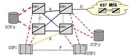 下圖顯示了各種類型的鏈路,各種類型的鏈路在物理上都是DS1或T1或E1中的一個時隙。這些鏈路類型 的定義和具體連接兩節(jié)點的鏈路配置有關(guān),定義這些鏈路類型的目的,是為了更好地管理網(wǎng)絡(luò),特別是為了減少網(wǎng)絡(luò)中斷的可能。為了提高網(wǎng)絡(luò)的可靠性,必需要有多個通道可以傳送消息。在ANSI和ITU-T的標準里,都有相應的規(guī)則說明如何通過各種類型的鏈路傳遞消息,(如下圖所示的網(wǎng)絡(luò)中,當從SSP1往SSP2發(fā)消息時,首先試圖從A鏈路發(fā)送消息,如果消息發(fā)送不出去,再試從F鏈路發(fā)送)。以及如何避開網(wǎng)絡(luò)瓶頸傳遞消息。