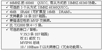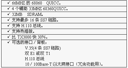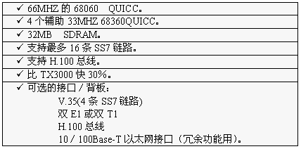 TX3000卡的功能大致和TX2000卡相同,但它比TX2000的性能2.5至5倍。TX3000卡上有一個66MHZ的68060協(xié)處理器。TX3000卡為SS7應(yīng)用配置1至4個QUICC通信控制器,最多16條信令鏈路,提供一個三口V.35,擁有雙T1或雙E1接口。(主板上標(biāo)準(zhǔn)配置一個QUICC,支持四條SS7鏈路,當(dāng)CT總線和串行接口都要使用,或者處理的鏈路超過4條時,可先配置有三個QUICC的背板,四個QUICC可支持16條SS7鏈路)。