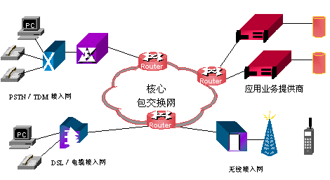 未來的網(wǎng)絡(luò)將會(huì)以基于數(shù)據(jù)包的網(wǎng)絡(luò)為核心,交換系統(tǒng)以IP交換和ATM交換等構(gòu)成,能實(shí)現(xiàn)包括語(yǔ)音、數(shù)據(jù)和視頻的所有交換需求。各種接入網(wǎng),如:無(wú)線網(wǎng)、有線電纜網(wǎng)、DSL、TDM(時(shí)分多路復(fù)用)交換網(wǎng)等,通過路由器接入到核心網(wǎng)絡(luò)。