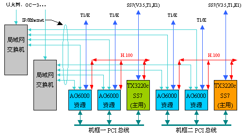 結(jié)構(gòu)圖中表示有兩臺機(jī)器,每臺機(jī)器都插有兩塊AG6000資源卡和一塊TX3220c卡。一臺機(jī)器是主用的,而另一臺是冗余備份的。AG6000完成媒體網(wǎng)關(guān)的功能,TX3220c完成信令網(wǎng)關(guān)的功能,媒體網(wǎng)關(guān)控制器是軟件實(shí)現(xiàn)的,沒有對應(yīng)的硬件。