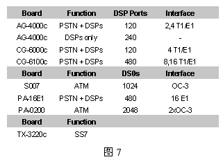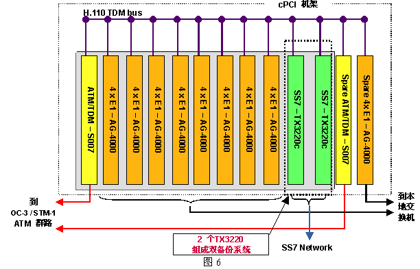 為具體起見,圖6給出一個960話音端口的應用方案,其中用到了三種NMS公司的設備:AG-4000c、S007和TX-3220c,圖中未列出用來運行應用程序的CPU板(AG4000系列板卡不含CPU,而AG600eC包含了CPU)。