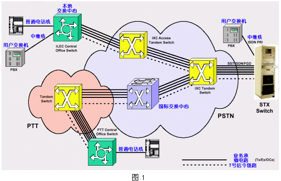 圖1給出了傳統(tǒng)電話網(wǎng)絡(luò)PSTN的組織結(jié)構(gòu)圖。它是目前規(guī)模最大的電話業(yè)務(wù)網(wǎng)絡(luò),通過(guò)標(biāo)準(zhǔn)的信令控制網(wǎng)絡(luò)(SS7),成為覆蓋全球的大型電話網(wǎng)絡(luò)。這個(gè)網(wǎng)絡(luò)和Internet互聯(lián)網(wǎng)有著驚人的相似,它們都采用級(jí)聯(lián)結(jié)構(gòu),具有易于擴(kuò)展的特性。