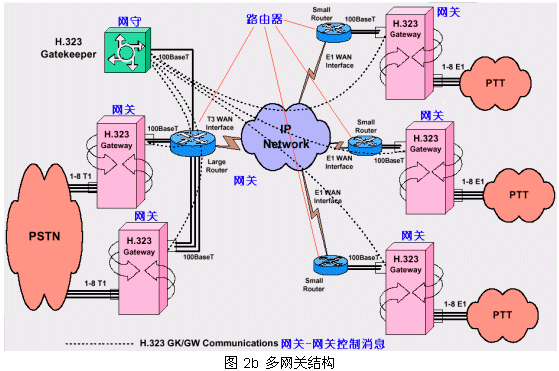 從PSTN來(lái)的呼叫被H.323網(wǎng)關(guān)受理,把其中的話音流轉(zhuǎn)換成IP數(shù)據(jù)包經(jīng)過(guò)IP網(wǎng)絡(luò)傳到目的網(wǎng)關(guān)下的指定電話終端;同時(shí)受理IP網(wǎng)絡(luò)來(lái)的呼叫(可以來(lái)自電腦終端或另一個(gè)PTT網(wǎng)絡(luò))轉(zhuǎn)向PSTN目的終端1。