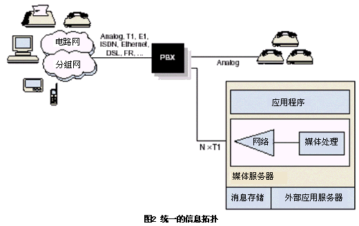 圖2是有前提的典型統(tǒng)一消息拓撲圖。這個例子中媒體服務器管理消息的存儲和提取,這些消息包括語音、傳真、數據或視頻。它可以訪問不同媒體文件以及必要的控制規(guī)則以實現各類媒體業(yè)務。可以在本地的媒體服務器上也可以在遠程的集中存儲系統(tǒng)上進行存儲。在這種情況下,能提供語音和傳真資源的統(tǒng)一的消息系統(tǒng)通常和email系統(tǒng)比如微軟的Microsoft