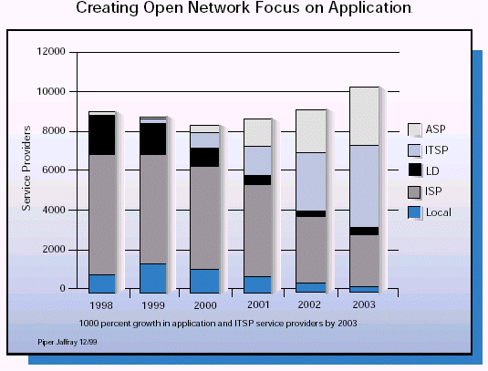 關(guān)于新的業(yè)務(wù)提供商的前景,ASP是最為熱門(mén)的,由于整個(gè)行業(yè)的外購(gòu)趨勢(shì),使得它吸引了數(shù)目巨大的風(fēng)險(xiǎn)債券和投資。但是如果說(shuō)他們只是關(guān)注外購(gòu)那就太籠統(tǒng)了。事實(shí)上一些公司是以托管為中心的,一些是以連通性為中心的,還有一些是以應(yīng)用為中心的。