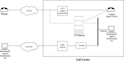 連接到傳統(tǒng)的ACD上. 主叫方的信息例如IP地址, Email地址等被傳送的哦CTI服務(wù)期. CTI服務(wù)期可以用這些信息去客戶數(shù)據(jù)庫中進行查詢, 影響到座席代表的路由,