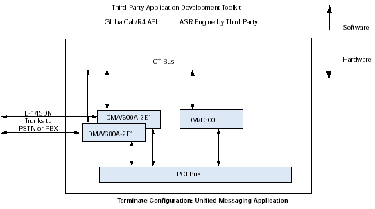 通過訪問計算機電話(CT)工業(yè)標準的ECTF H.100/H.110 CT Bus,利用DM/V-A多功能資源系列板卡,應用程序可以具備交換能力以及擴展到其他技術的能力,諸如網絡接口(DM/T或者DM/N系列),ATM連接,SS7,以及IP電話。