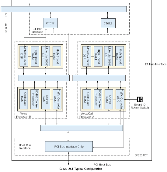 D/320-JCT板卡通過與外部網(wǎng)絡(luò)連接的CT總線接口與網(wǎng)絡(luò)接口板卡相連。DSP資源通過一個(gè)CT612模塊接收數(shù)字語音數(shù)據(jù),CT612作為到CT總線的接口。DSP基于下載到它的高速RAM中的Spring
