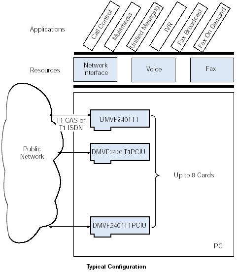 利用DMVF2401TIPCIU以及DMVF3001E1PCIU板卡可以構(gòu)建復(fù)雜的、集成的通訊系統(tǒng)。用戶可以方便的向該系統(tǒng)加入很多功能,比如語(yǔ)音回應(yīng)、按需傳真、傳真廣播、統(tǒng)一消息以及呼叫控制服務(wù)。