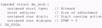 。。速度/音量調(diào)節(jié)表(DX_SVMT)數(shù)據(jù)結(jié)構(gòu)有21個(gè)代表不同級(jí)別的速度和音量的條目,用于指定信道的速度或者音量調(diào)節(jié)的變化率。這些值可以設(shè)置或者用dx_setsvmt()和dx_getsvmt()從表中取值。