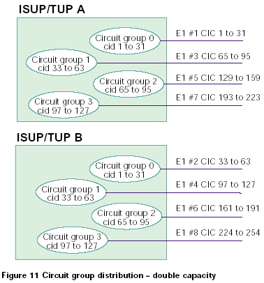兩個(gè)系統(tǒng)中的電路組既可以從0開(kāi)始編號(hào),也可以兩個(gè)系統(tǒng)間隔標(biāo)號(hào)。如果使用第一種方法,整個(gè)系統(tǒng)的容量就是單ISUP/TUP協(xié)議層系統(tǒng)的容量的2倍,如果使用第二種方法,系統(tǒng)總?cè)萘颗c單ISUP/TUP協(xié)議層系統(tǒng)的容量相同。對(duì)于這兩種情況,每半部分控制對(duì)立的CIC范圍,如圖11和12所示: