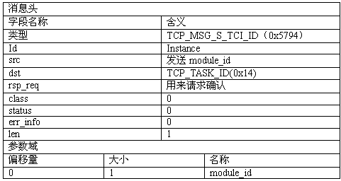這個(gè)消息為一個(gè)指定的TCAP實(shí)例設(shè)置module_id,當(dāng)發(fā)送任何來(lái)自網(wǎng)絡(luò)上的帶有事務(wù)id中指定實(shí)例的消息時(shí),TCAP使用這個(gè)module_id作為目標(biāo)節(jié)點(diǎn)。