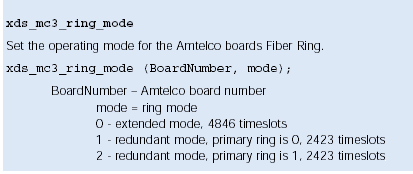 使用xds_mc3_connect、xds_mc3_listen、and xds_h100_listen函數(shù)分配由Amtelco卡使用的時(shí)隙,xds_mc3_connect在光纖環(huán)路和CT總線之間創(chuàng)建一個(gè)全雙工連接,所有的參數(shù)都可以在Amtelco板上得到。CT總線傳輸?shù)膮?shù)是Amtelco卡將要傳給CT總線CT的。